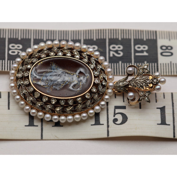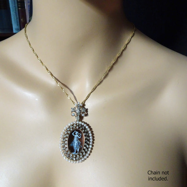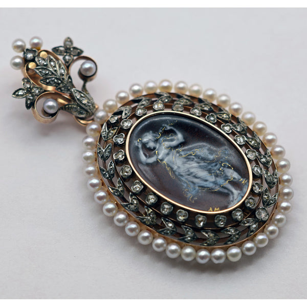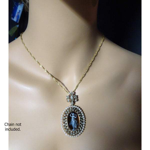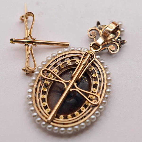 Brooch-Pendant: Oval in shape, rising to a higher plane on the sides. Border of pearls encloses 'shoulders' composed of concentric rings of gold supporting an outer ring of forked foliage, finely set with small rose cut diamonds. The inner ring composed of flowers formed by gold colettes also containing small rose cut diamonds. Diamonds appear to float in the air. An inner border of gold contains an enamel plaque. Plaque is slightly concave, has a brown ground that glimmers gold, with white enamelled classical Roman or Greek figure of a dancing woman in diaphenous robes, highlighted with gold. Robes and hair fly as she twirls, arms raised. A tall Grecian urn stands slightly behind her.