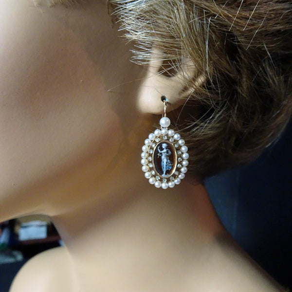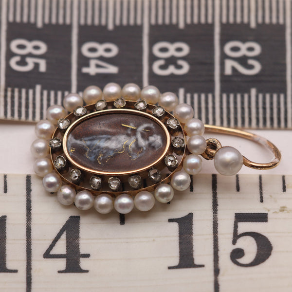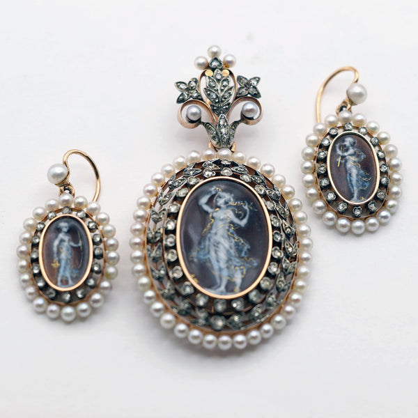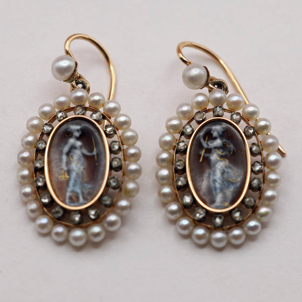 Earrings: Earrings echo the form of the brooch, being oval in shape with an outer border of pearls, followed by an inner border of gold rings holding diamonds that seem to float in the air. They are in the same flower form as the inner diamond ring of the brooch-pendant. Similar plaques form with Classic Greek or Roman figures, one facing left and one facing right. A loop connects the plaques to a pearl surmount. Simple gold wires. Wires like this are often replacements making them easier to insert and comfortable to wear.