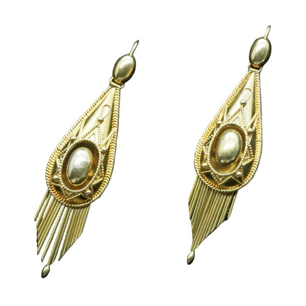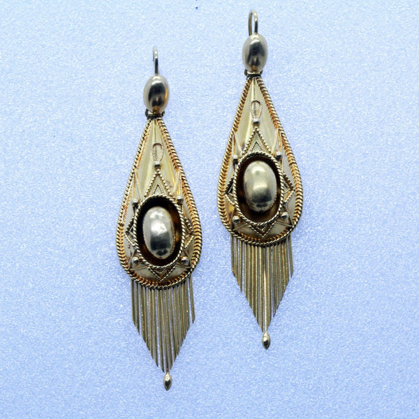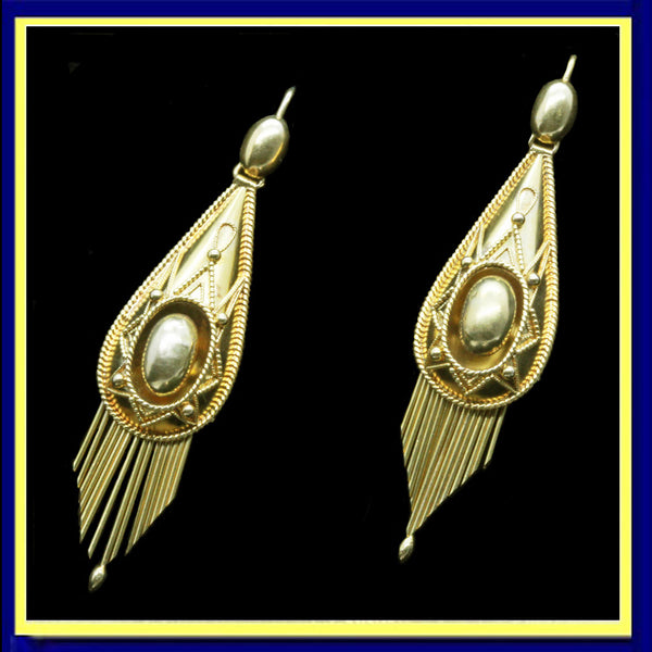 Description : Exceptional earrings in the Etruscan or Classic Revival style depicting the mania for everything ancient during the 2nd half of the 19th century. The earrings are entirely made of 18k gold. Small oval surmounts with a triangular fitting at the back to suspend the main body of the earrings which are elongated rain-drop-shaped. The surface decorated with various forms of rope-twist and beaded filigree wirework as well as small granulations of gold beads. The wide bottom is hollowed out and encloses a large golden oval giving a multi-dimentional facet to the ear pendants, already rich with adornment. A long golden fringe is suspended from the earrings. Fringed earrings were the rage during the 1870's throughout Europe, but especially in England. Each section moves independantly, so that in addition to the interest inherent in the decoration of the earrings, there is the additional aspect of continuous, multiple movements.
