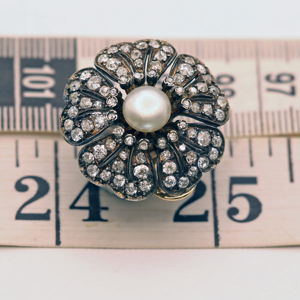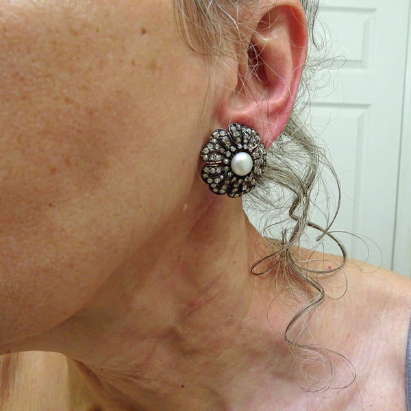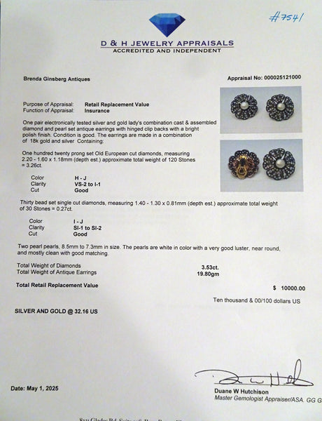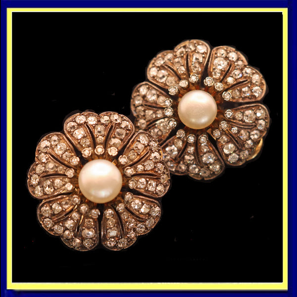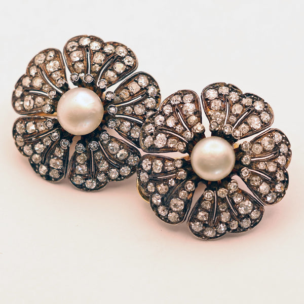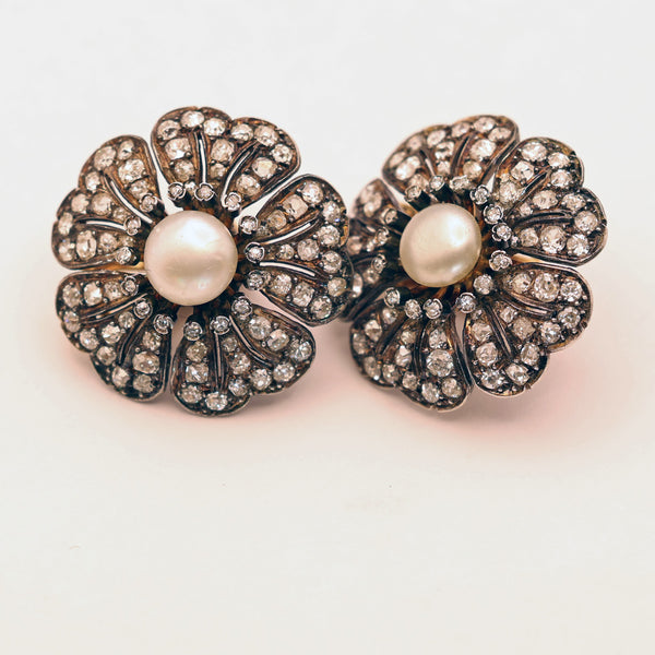 Description : Large earrings - ear clips. Curving flower form. 5 complex petals - each like a butterfly wing, finely set with old mine cut diamonds coming together in the middle to a ring of diamonds on gold stalks surrounding a pearl. As was the custom during the 19th century, diamonds are set in silver over gold in order to show them off to better effect in candle or gas light. Pearls have not been tested.