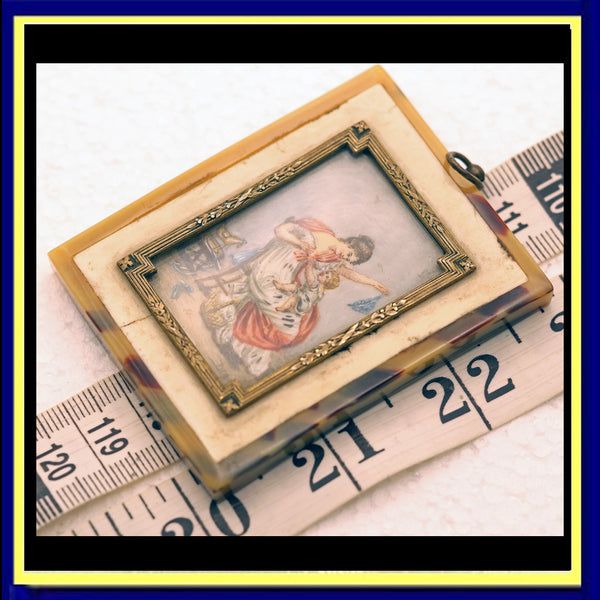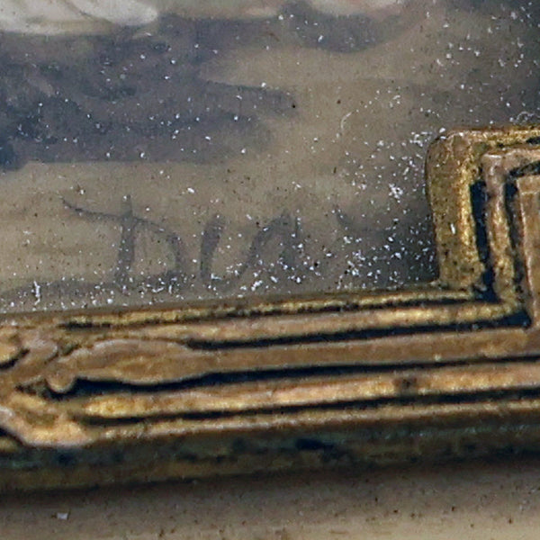 Measurements: frame is a little over 2 inches wide X 2 5/8inches long; painting 1 1/4 X 1 7/8 inches
