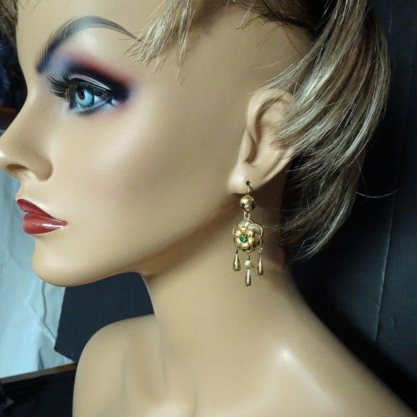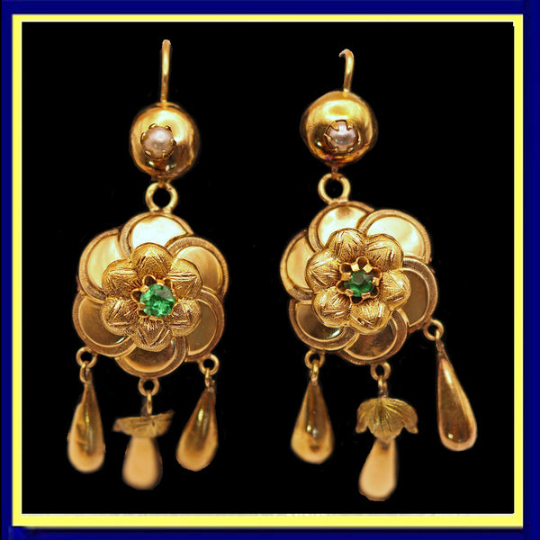 Simple round half globes set with pearls form the surmounts of the earrings. A pair of loops connects them to the central body of the earrings - double flower forms. gold in smoothe and stippled textures for added interest; layers of petals rising to culminate in a bright green paste. The previous owner wanted to replace the paste with pearls, but I persuaded her to leave them as is, which is the original way they were made and which is typical of French provincial jewelry. Three dangling elongated tear-drops form a fringe below the body. They are connected via gold loops, allowing each one to swing and sway as the wearer moves. The central drop with a foliate overlay at the top. The stippled foliage matches the textured edges and petals above it.