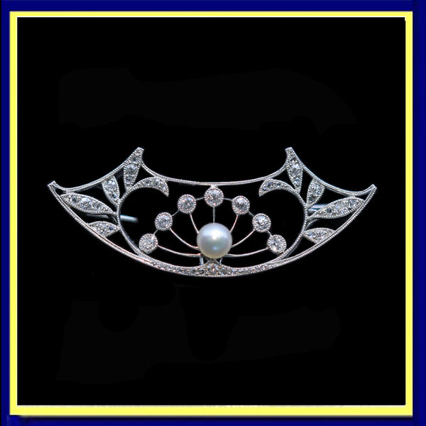 Description : A wonderful combination of natural and design simplification that results in a superb brooch. A half-circle swoops up forming a bat-wing design that places as much attention on the spaces as the superbly fine platinum and diamond work. An arc of flowers or berries, colette-set-diamonds on exquisitely fine knife-edge stems that fan out from a central pearl that gleams in the lower center of the brooch. Around this arc of berries are gently curving stems supporting fine foliage, minisculy set with diamonds that glisten and gleam, grabbing the eye's attention. Far from flat, the brooch rolls, curves and waves - undulating from front to back as well as from side to side.