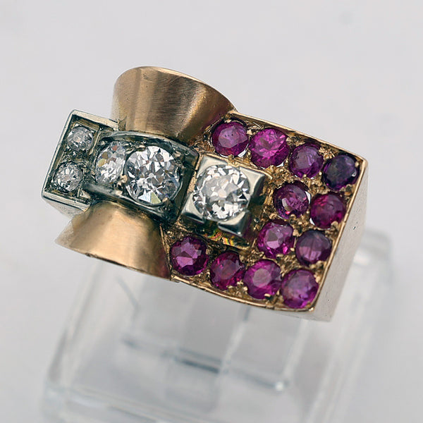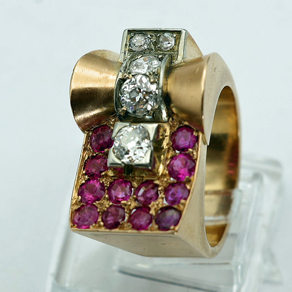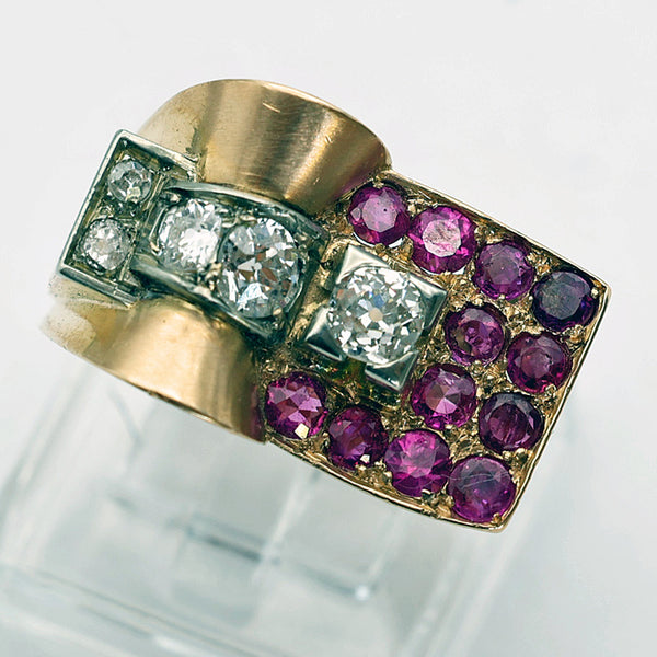 Vintage Retro tank ring. 18k gold, diamonds, rubies. Made in France circa 1940's. Unisex - can be worn by a man or a woman.