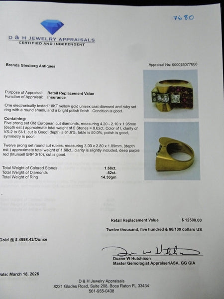 Description : Bold geometric design combining squares, cylinders, lines and circles. Asymmetric but perfectly balanced. A flat square plane, pave set with beautiful, bright and sparkling rubies. Intersected by a raised, cylindrical form - fanning out on either side of a line of diamonds that crosses it and overlays part of the ruby square. The line of diamonds ends in a partial rectangle. The varying sections of the ring are of varying elevations - the lowest height being the rubies, then the diamonds and cylinder. The diamonds cover and traverse the cylinder. Shoulders are flaring, solid walls of gold, emphasizing their role as supporters of the bezel. Shoulders narrow and transform seamlessly into a broad, sturdy band.