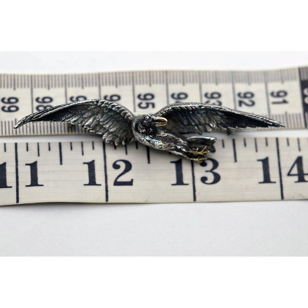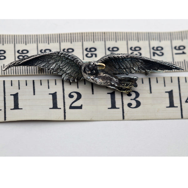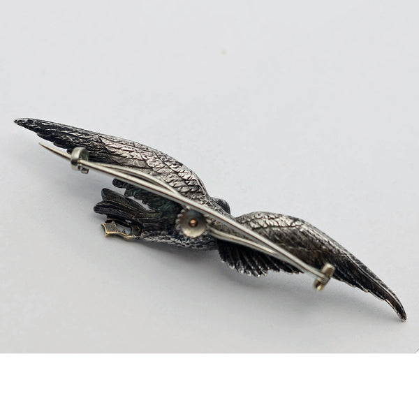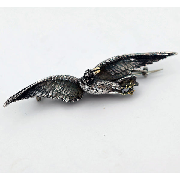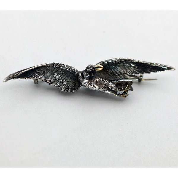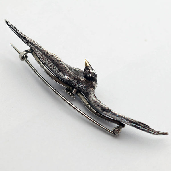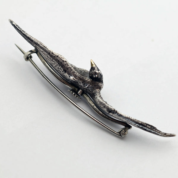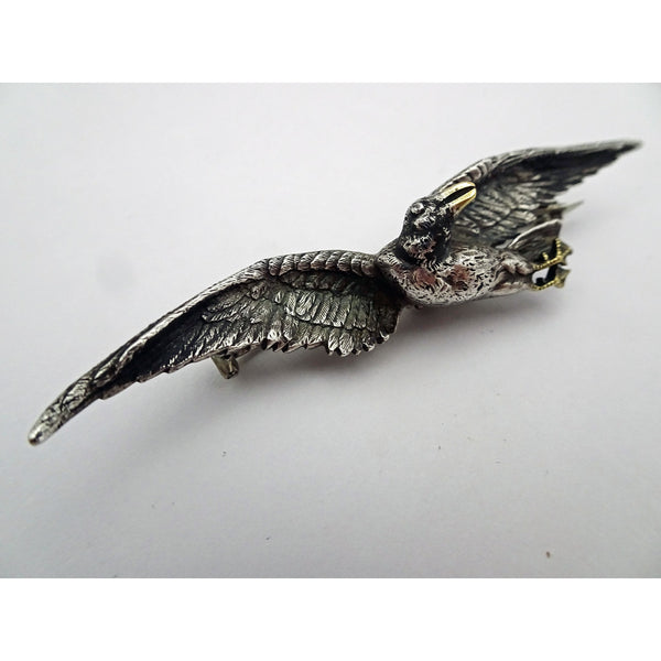The brooch depicts a silver bird in flight, its legs drawn up under its body, winged outstretched and twisting around to look back over its shoulder. Highly realistic chasing and modelling - each feather is individually portrayed, we see a minute protruding eye and a beak in gold. Gold feet are webbed and also detailed, so we think it is a kind of duck. Modelled detail continues all the way around this 3-dimentional miniature sculpture.