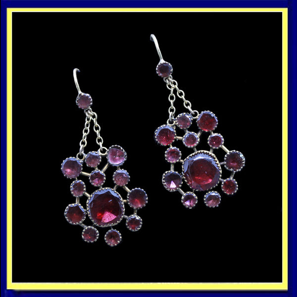 Deep red garnets with a very rich inner glow. Flat cut as was the style and technical limitation of the period and set in gold with crimped edges. Closed backs. Stones connected to one another via sturdy gold wires, (a little like an old Meccano set), which seems to have been typical of the period. Earrings attached via a pair of gold chains to small garnet surmounts. This adds length and lightness and allows the earrings to swing as the wearer moves. Light between the gold and garnets also gives a magical airy effect and catches the garnets at different angles, glowing and gleaming as a result. Ear wires are replacements as is almost always the case with very old earrings.
