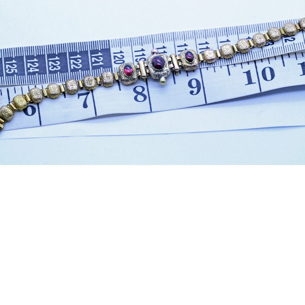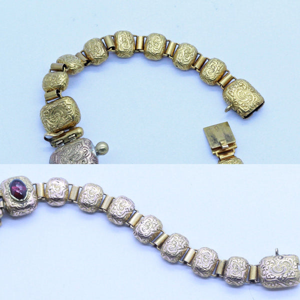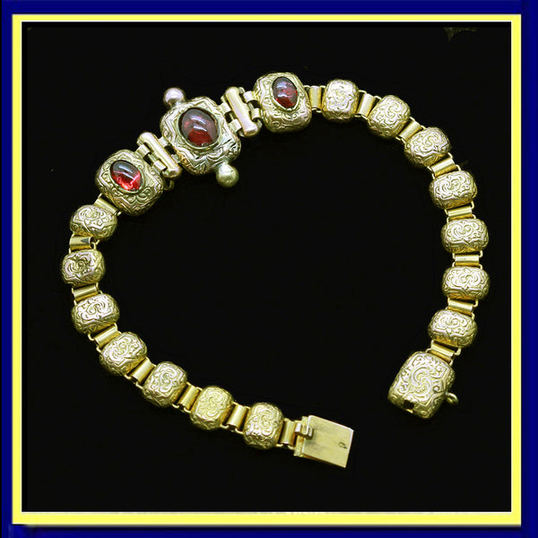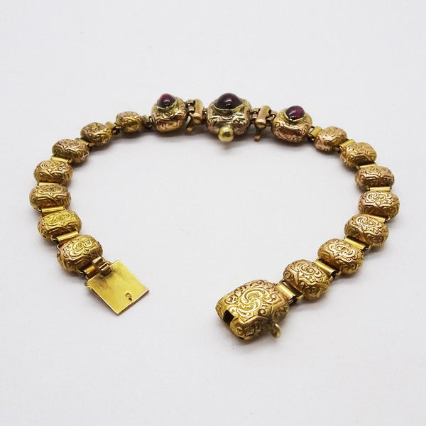 Description : Hollow rounded rectangles, very richly chased and engraved lead to a central trio of identical, but larger rectangles, each set with a cabochon garnet or carbuncle as the Georgians and Victorians called them. Central portion with protruding golden globes. Sections joined with tubular links and cylindrical links in the central portions of the bracelet. Very fine work, typical of the Georgian era. Tongue in Groove clasp is secure. There is also a loop for additional safety chain if desired. Cylindrical joints of central portion have curly hooks at the back, from which charms or other enhancer attachments can be looped. Gold is bright yellow for the most part, but shades to a reddish pink in central areas.