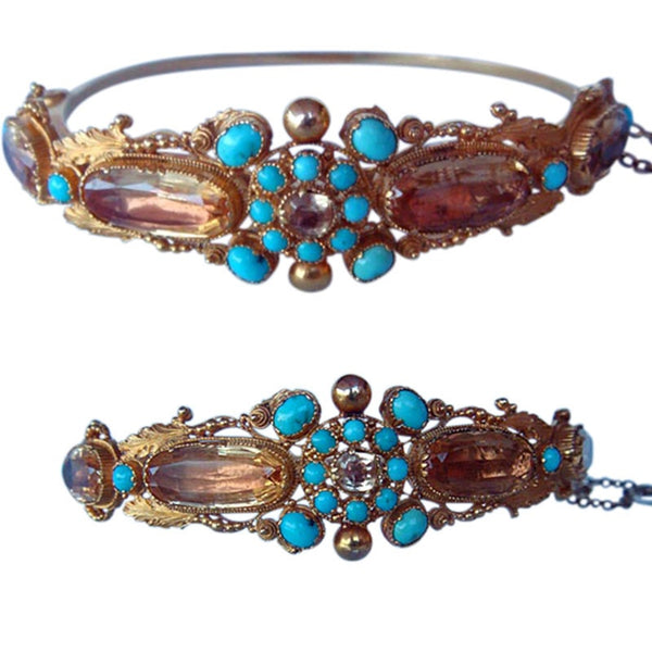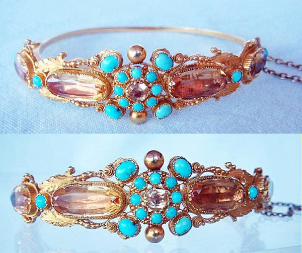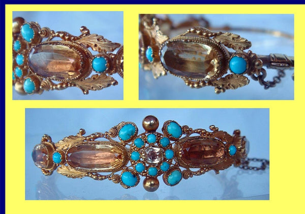 Antique, Georgian bracelet / bangle. 15ct gold set with topaz and turquoise. Made in England circa 1820 -30's.
