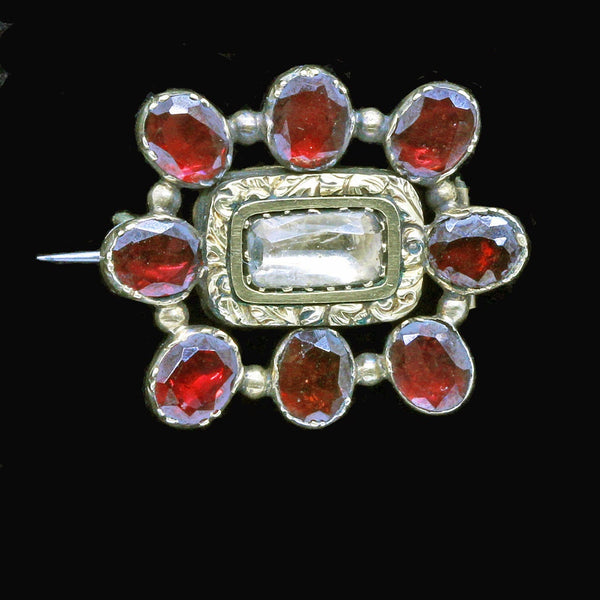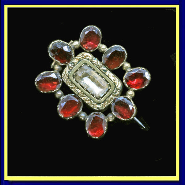 Radiating around the central rectangle is a circle of oval garnets. Flat tops with very gentle facets on the sides. Typical of the Georgian period and much beloved by the English at the time. The garnets are typically enclosed in gold,which adds mystery and light to these gems that glow a rich red. Round gold beads connect the garnets to one another. Marks and Metal: No marks, as is to be expected of jewelry from this period. The gold was acid tested and stays for 14k.