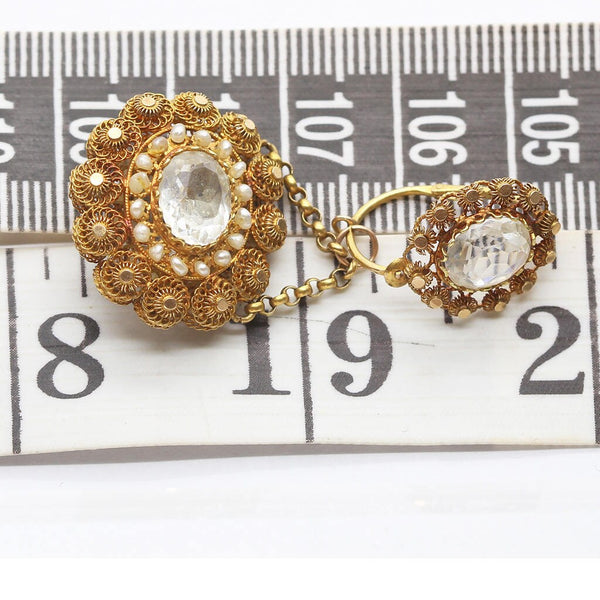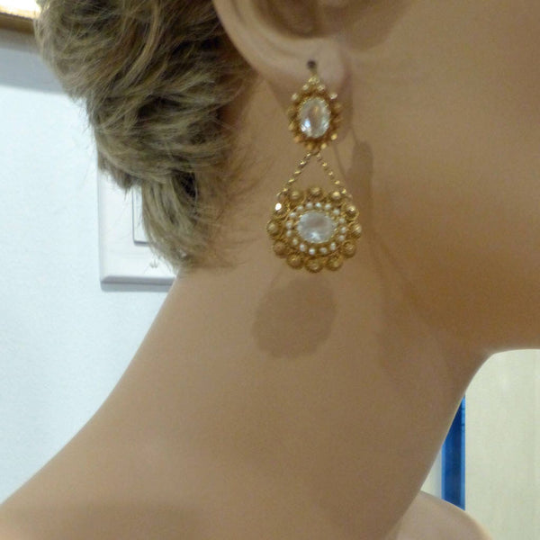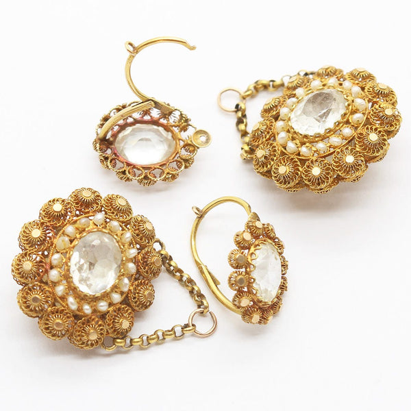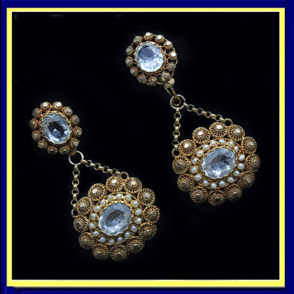 Description: Surmount of faceted, clear paste (imitation gems) surrounded by fine gold wirework floral cannetille filigree frame and inner circle of tiny natural pearls. The surmounts can be worn alone by day and the drops added for a much richer look at night. Hence the term day/night or top/drop earrings. A loop is suspended from the wires of the earrings and a pair of gold chains divert from the loop. They are connected on either side to the drop. Drop is round in shape and also has a central faceted paste gem surrounded by a ring of small pearls and then beautiful cannetille filigree flowers in gold. Unusually, the drops are identical on back and front and the maker went to the trouble and expense of making the same cannetille wire work and paste settings on both sides.