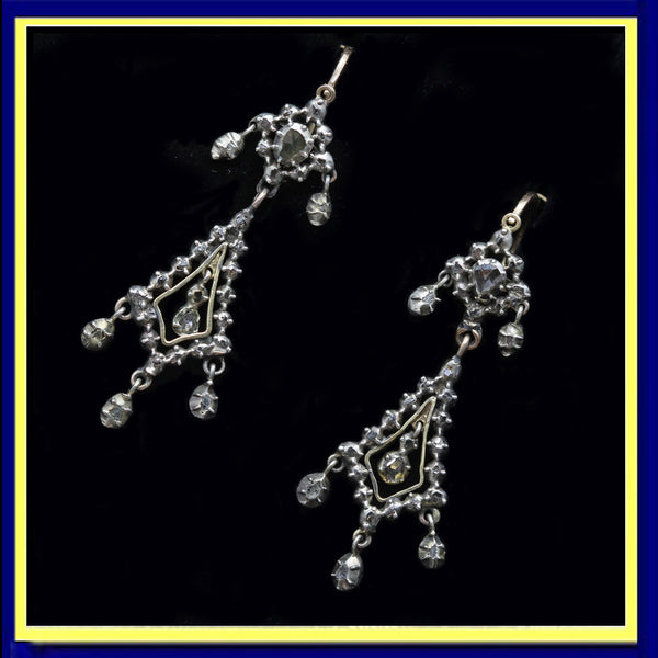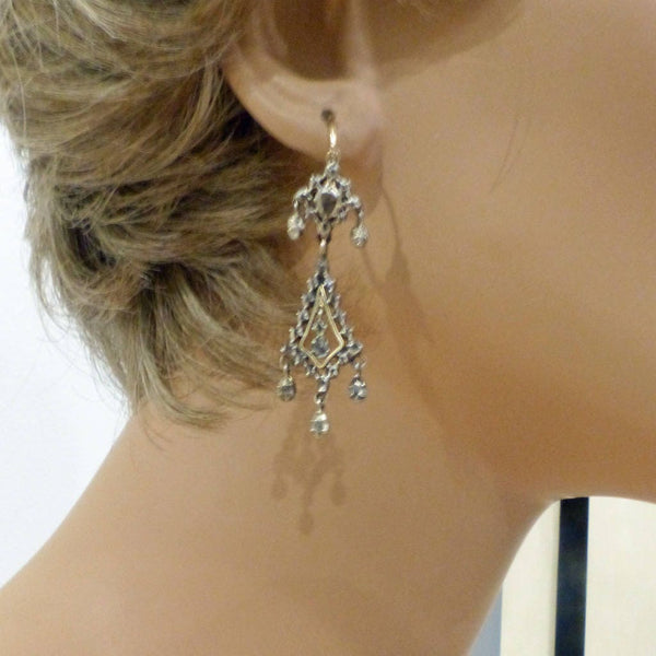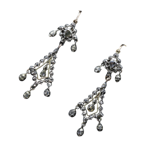 Description: Marvellous earrings made of openwork silver over gold, the metal pulled over rose cut diamonds and a central gold linear frame. There are two main sections: the tops or surmounts are diamond-shaped. In the center is a relatively large rosecut diamond surrounded by an openwork border of similarly set diamonds that seems to float around the center. A pair of diamonds connected by loops on either side of the surmount sway in every direction. Loops connect the drops, which are elongated kite shapes of a similar openwork design to that of the top, but with a solid gold inner border. Again, the parts seem to float independantly of each other. The central diamond of this section is also connected to the main structure via loops, so that it too swings independantly. A bottom fringe of three more rose cut diamonds suspended from loops tremble and swing as the wearer moves.