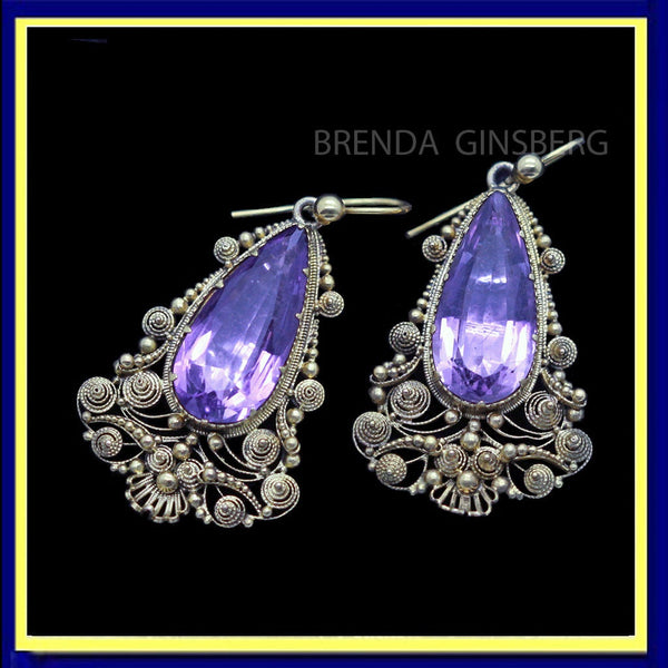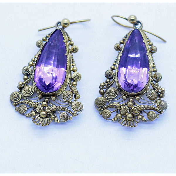 Description : Classic Georgian elongated pear or tear-shaped drop earrings. The close-backed Amethysts are a lovely purple color. They are held in colette settings. The colette settings are very interesting with parallel engraved lines and wavy, curved tops, some of which extend right over the upper edge of the amethysts, holding them in the same way as a more modern claw setting. The color of the amethysts are wonderfully complemented by the gold. In contrast to the solid, strong stones, they are highly detailed with very fine filigree work that twists and spirals, forming 3-dimentional, sculptural forms, notably pyramidal forms. Golden spheres of differing sizes are intersperced between the filigree work and add interest and connect some of the openwork sections. An openwork shell of gold at the bottom. Gold wire fittins are almost certainly replacements, which is very common in Georgian earrings. They are easy to insert and very comfortable to wear. Workmanship is excellent. Exquisitely fine cannetille like this cannot be reproduced. In fact, even the Victorians attempted to make cannetille jewelry and their efforts are much clumsier. The finess of the Georgian work is unmatched. The earrings are extremely elegant and yet comfortable to wear. Unassuming and yet stunning.