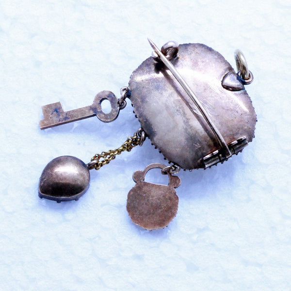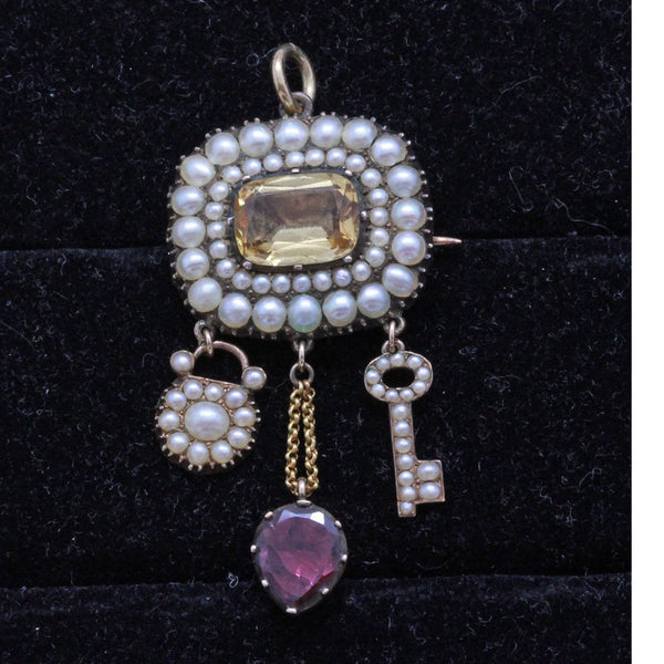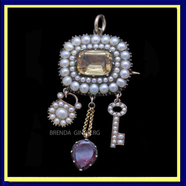 Description : Slightly rounded rectangular upper section with a raised rectangular foiled natural topaz of a golden color surrounded first by a ring of very small pearls, followed by a border of larger pearls, set in a gold mount with pinched sides. Dangling from the bottom of this section is a tiny lock, a key and to complete the romantic theme, a hear in the center. Lock and key connected to surmount via small loops while the heart-shaped garnet gains length by dangling from a double gold chain. Lock and key are set entirely with little pearls. A loop on the top allows the jewel to be worn as a pendant. At the back is a hinged pin with a c-shaped clasp. Pearls are the original, natural pearls. Exceptional in every way - from the aesthetics to the workmanship. Workmanship is exquisite. The pearls are well-matched in size and color and very finely set. Luscious, deep velvety red garnet. Warm glow of central topaz. Romantic theme perfect as a Valentine's Day gift or for a wedding or engagement. As wonderfully wearable today as it was over 200 years ago.