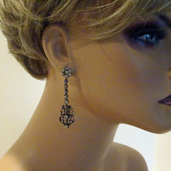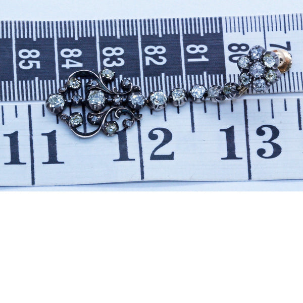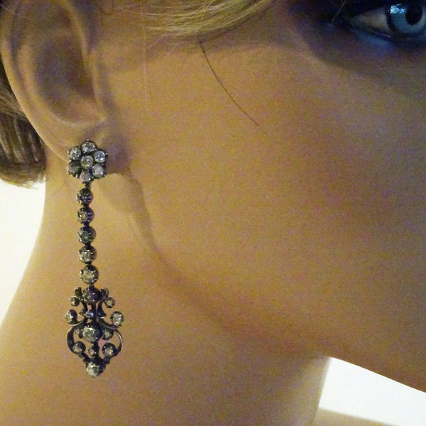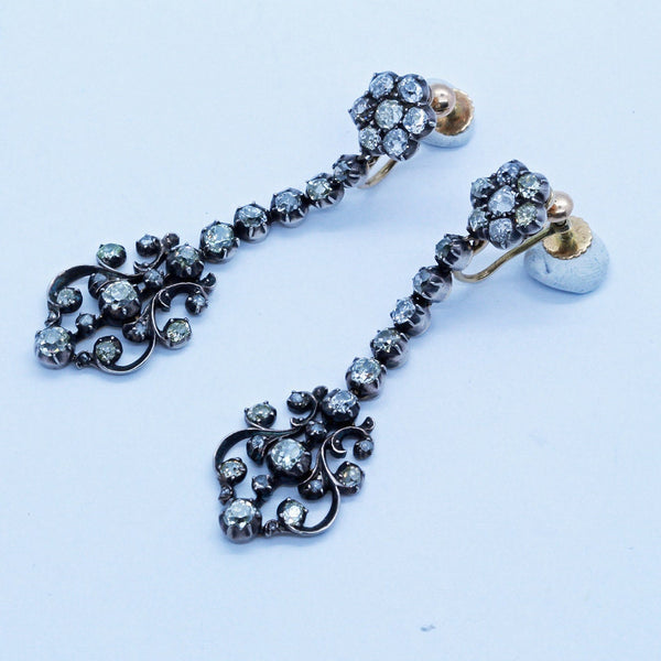 Description : Like all good antique jewelry, the metal is gold at the back and silver on top, in order to show the diamonds off to best advantage in the candle or gas light of the period. Collette settings hold the Old Mine Cut, square-ish shaped diamonds, lovely cushion cuts, fat and lushious, typical of the Georgian era. The surmounts are flowers, what the French call 'Marguerite', which suspend a long, long line of articulated diamonds, that give a lot of movement and flexibility to the earrings. These descend to a more spacious line of diamonds surrounded by openwork scrolls in a stylised flower form, highlighted with smaller diamonds. It is extremely rare to find an original pair of earrings from this period as most were broken into constituent parts for use in other jewelry. We can forgive the replacement of the fitting for the more modern late Victorian / Edwardian woman who did not have pierced ears. This can easily be re-converted to a post or wire by a future owner.
