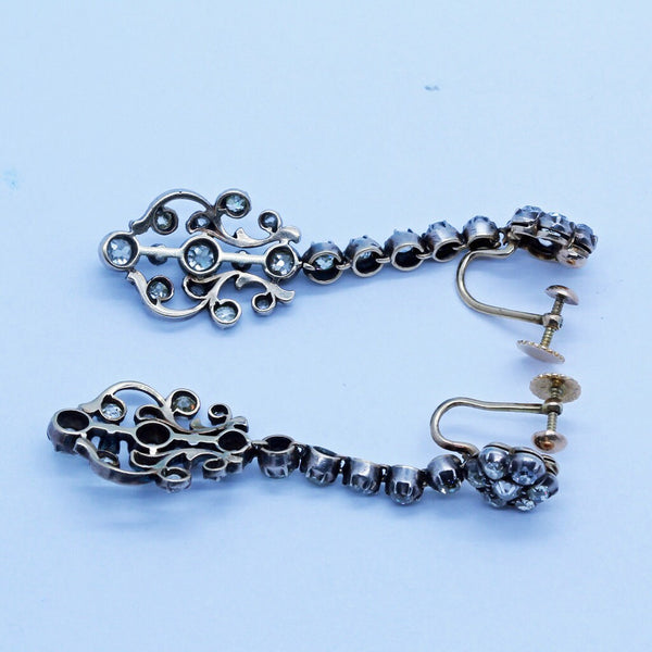 Antique Georgian / Victorian earrings long ear pendants. 14k Gold, silver and Old Mine Cut diamonds. Believed to date to early 19th century with later screw-back fitting.
