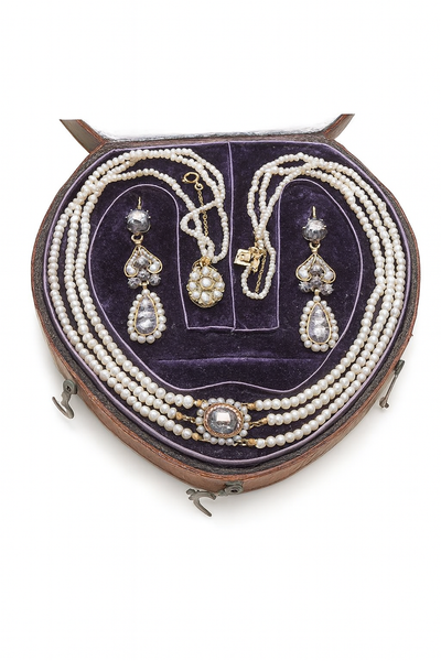 Antique Georgian parure set consisting of necklace and earrings. 18k gold, silver, diamonds, natural pearls. Made in France circa 1819-1840. Comes in fitted box. Suitable for a bride. Appraisal. Measurements: Weight of necklace is 15.0 grams. Earrings weigh 8.7 grams. Large table diamond on pendant measures approximately 9X5mm. Length of necklace is approximately 14 inches (36cm). Description : Pearl necklace made to sit at the nape of the neck with strands that hang in swags, known as en esclavage in French. The center of the necklace in the form of a rounded oval with concentric rings of pearls, gold, silver and with a very old cut (almost table cut, but slightly more faceted on the sides) diamond in the center. Silver was used to set diamonds at that time, so all diamonds were set in silver with the rest of the mount, including back of the silver, in gold. tongue-in-groove clasp in the form of a flower, set with pearls. Long dangling earrings or ear pendants. Known as top/drop or day/night because the tops can be seperated from the drops and worn alone for a simpler look by day. At night, the long, elegant drops would be simply threaded back onto the wires of the tops. As was the custom during the 19th century, the earrings were inserted from the back to the front of the earlobe and while many earrings from the period have been altered, these are totally original. Surmounts are an old square mine cut diamond set in silver over gold. Very typically French. Drops in two parts - a scrolling fan with the apex on top, lined with gold ribbon, bordered with pearls and centered with diamonds. The diamond bottoms lead via loops to the pear-shaped drops - again outer pearls, an inner border of gold and a central line of bright, gleaming diamonds. Drops swing and sway independently as the wearer moves. Backs are enclosed in gold, typical of the Georgian period. The set comes in an antique fitted box which is most likely original. It does have place for a brooch or ring - lost over the years. the heart-shaped box with red leather outside, silk inner lid and velvet fitted bottom. Hooked clasps to close the box. The necklace has a gold safety chain which is a later addition, but adds security to the wearer. Beautiful set, especially suitable for a young girl or bride. Marks and Metal: Not unusually for French jewelry, the gold has been assayed on more than one occasion. Looking at the pearl clasp, we see both the French eagle head and the ram's head that indicate 18k gold. The ram's head was used for 1819-1838 and the eagle's head from 1838. One of the loops that joins the central pendant to a pearl strand has a mark - not clear which one it is. Tongue of clasp has French eagle head. Earrings with gold mark (owl) and silver mark (swan). Safety chain loops are hallmarked. Condition: Good with minor wear commensurate with age. Please see enlarged pictures and don't hesitate to ask questions which we will do our best to answer. Professional, idependent appraisal.