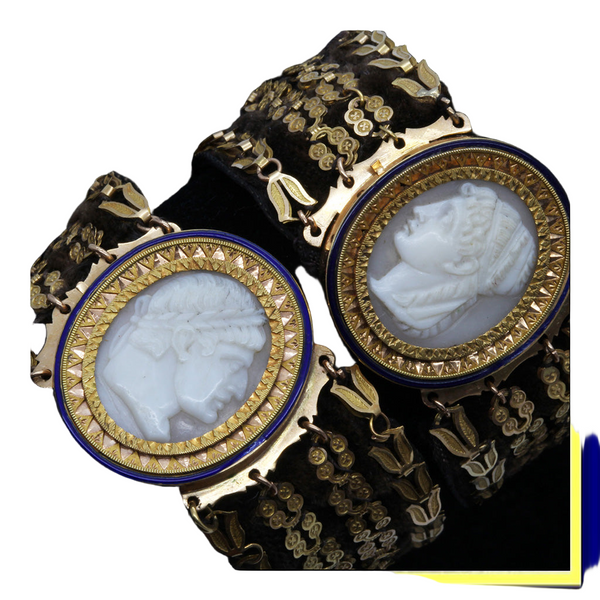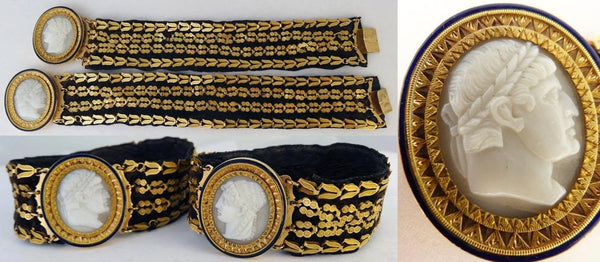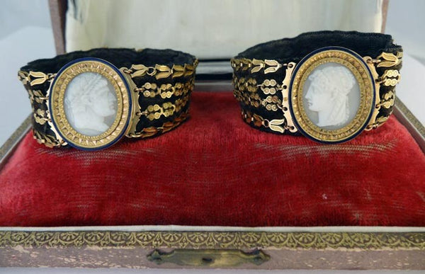 THE STORY: Napoleon and Josephine were huge fans of cameos, not only bringing enormous quantities from Italy to adorn their fabulous jewels, but even starting a cameo carving school in Paris. Much of Napoleon's reign depended on his heroic image. He saw himself as Emperor in the line of the great Roman Emperors and thus he was depicted in paintings such as the famous David depiction of his coronation and of course, in other works of art such as these cameos. Josephine was expected to support and buoy his image and thus to dress the part, including wearing dresses in the style of the ancient empresses and jewelry that depicted them. It's unknown who these fabulous bracelets belonged to, but they do date to the actual Napoleon Bonaparte Empire and may well have been worn by someone close to the Emperor and his court.