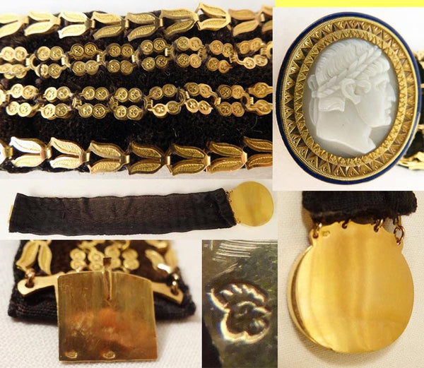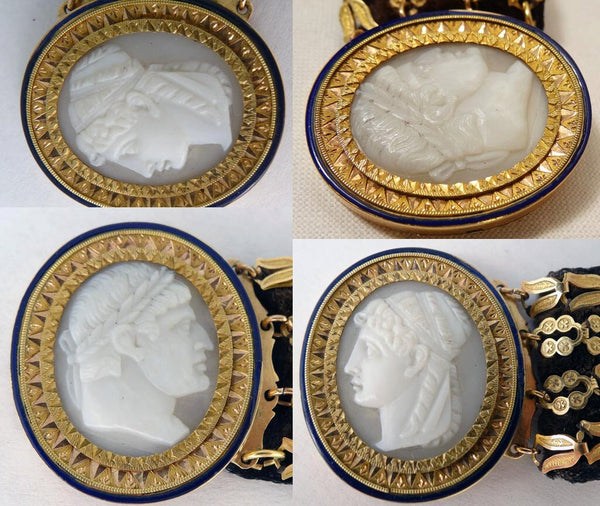 Antique First Empire Georgian pair bracelets. 18k gold, enamel and agate hardstone cameo miniature portraits of Napoleon and Josephine. Made circa 1804-1809 during the reign of Napoleon I in France.
