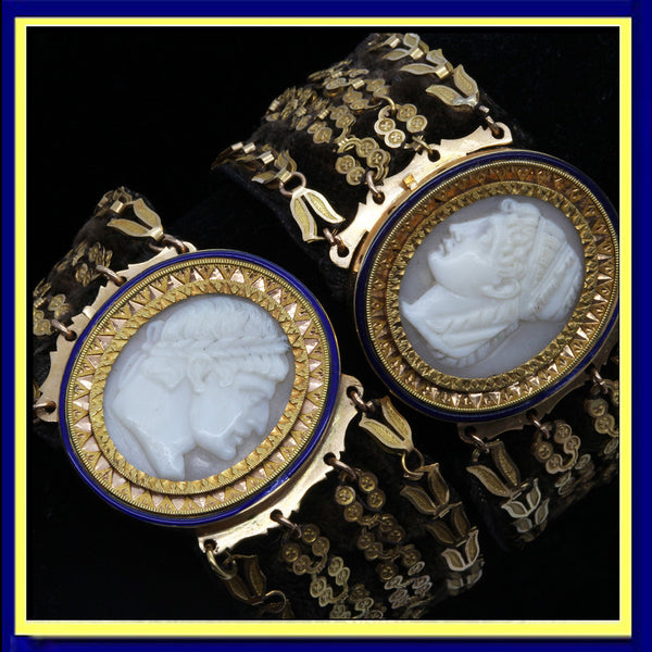 The cameos form the magnificent clasps of a pair of classic Georgian First Empire French bracelets. Dating to the lifetime of Napoleon Bonaparte (corresponding with the Georgian era), a pair of carved agate hardstone cameos depicting miniature portraits of Napoleon and Josephine, the Emperor and Empress. Napoleon in profile with laurel leaf, curved nose and sharp chin. Fine detail to hair locks and features. Josephine, in the popular guise of a Classic (ancient Greek/Roman) Empress, also seen in profile with similar fine detail. Each cameo is set in a gold medallion with very fine detail in alternating rings in tiers with a rich blue enamel border.