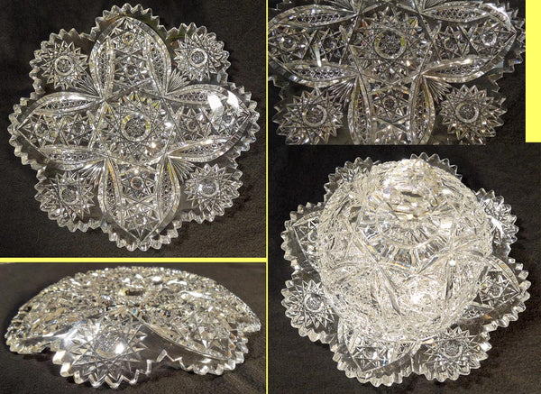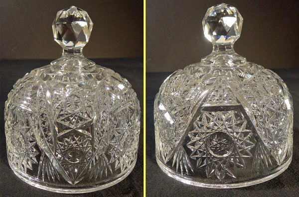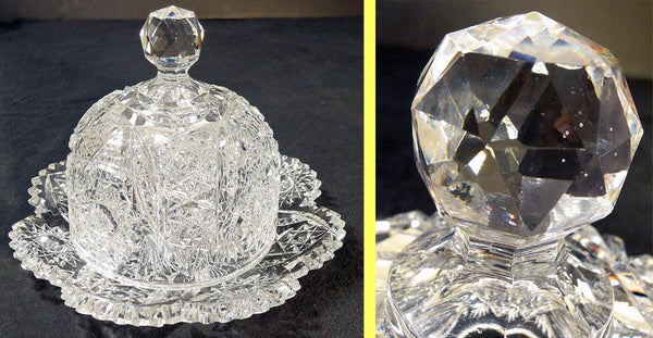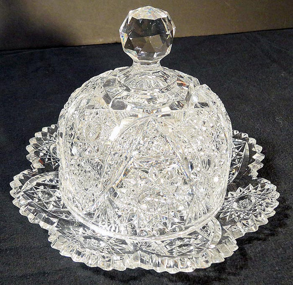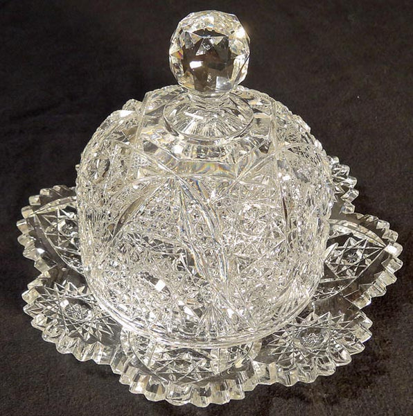 Antique American Brilliant Cut Glass Butter dish and dome. Made circa 1880-1910 USA. Possibly Libbey or Hawkes - looks a lot like the Hawkes Venetian pattern. .