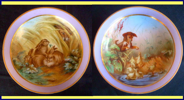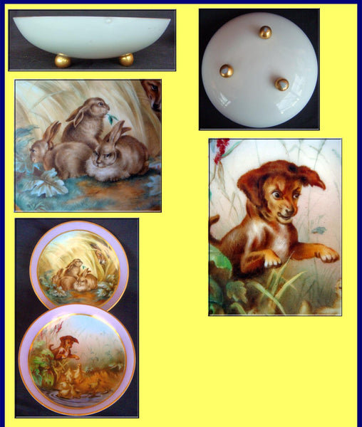 Antique pair of opaline glass bowls, each hand painted with a scene of little animals hunting.