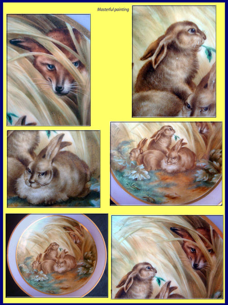 In the other painting, a sly fox peeps through the long hay in front of which a group of bunnies is nibbling on large leaves in a little clearing.