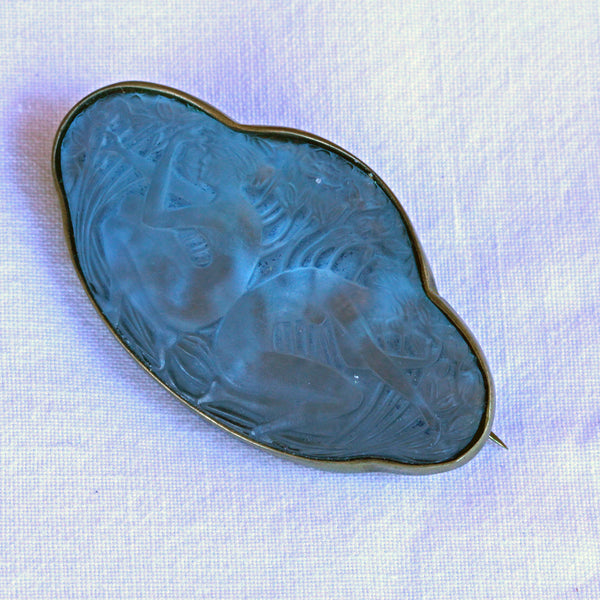 Scalloped and curving oval shape. The mould, numbered 596 depicts two identical nude woman, bent over at the back, facing away from one another. They sit in a field of flowers and poppies. Lingering influence of the Art Nouveau movement with the sinuous forms, botanical background and feminine subject. The glass is set in a gilt metal mount, entirely closed at the back and with a sturdy hinge and c-clasp.