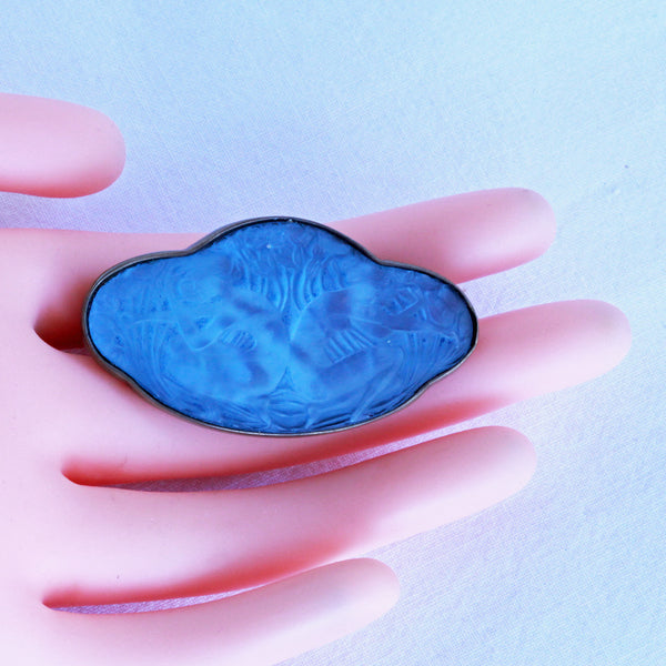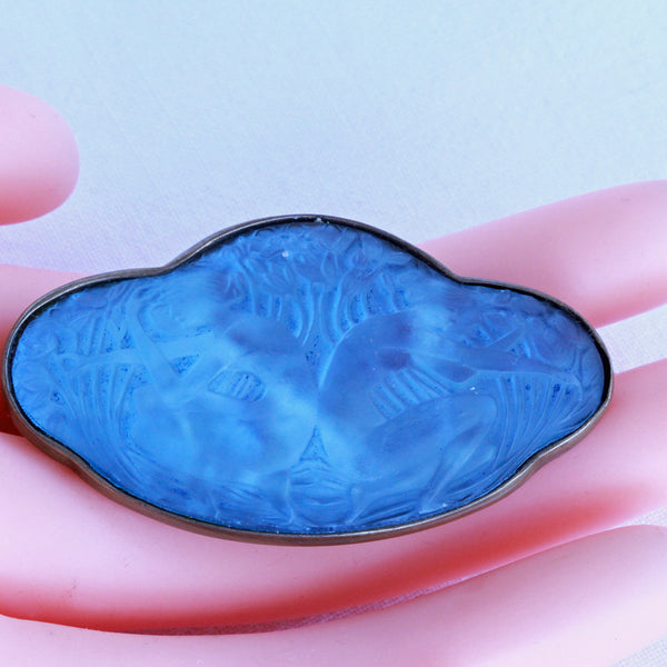 Antique brooch. Blue glass and gilt-colored metal. Made in Paris, France by Rene Lalique. Model #1388 created 1913 and discontinued prior to 1947. This example likely dates to circa 1920.