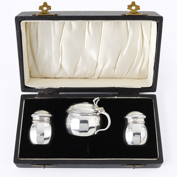 Mustard and salt are hallmarked with maker A.S.P. CO; anchor (for Birmingham), lion (for sterling silver), date letter H for 1932. Pepper is similarly marked but date is J and maker is E.E.