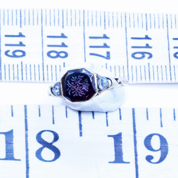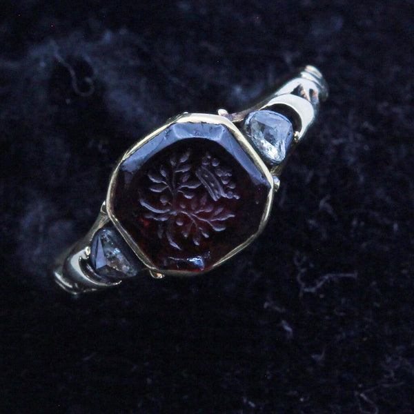 Description : Small ring as versatile and wearable today as it was about 400 years ago. The bezel is an octagon of square proportions set with a deep red garnet, beautifully intaglio carved. The ring must have been owned by Royalty as it depicts crossing stems of fine foliage under a crown. An early signet ring - Since ancient times, intaglio carved rings were used as signatures - the carving was the equivalent of today's signature when pushed into wax or clay, leaving the impression of the wearer's house. They were therefore, strong symbols of power - whoever wore the ring, had the power.