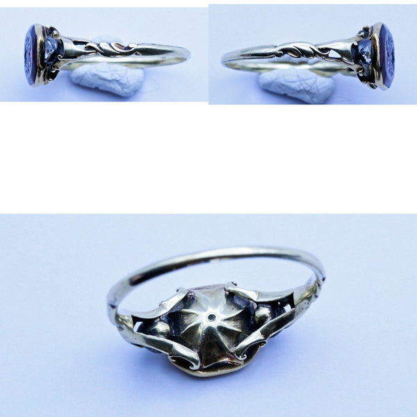 Rose cut diamonds are held on the shoulders by gold 'lobster' claws that scroll down the sides of the ring and twine with more golden foliage. The rest of the shank is simple, gold, unadorned as was usually the custom at the time. This ring could come from the portrait painting of many a European noble person, but it is as wearable and timeless today as it was back then. The ring can be worn by a man or a woman.