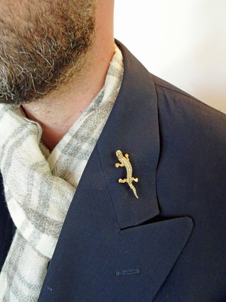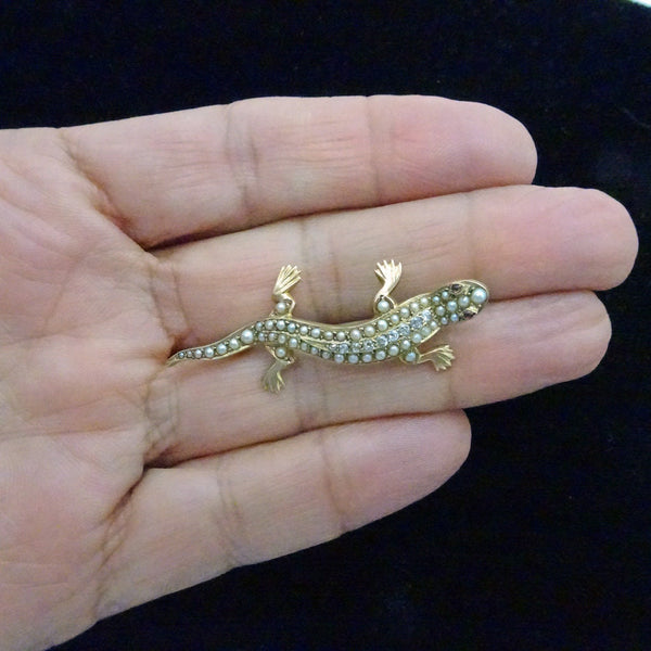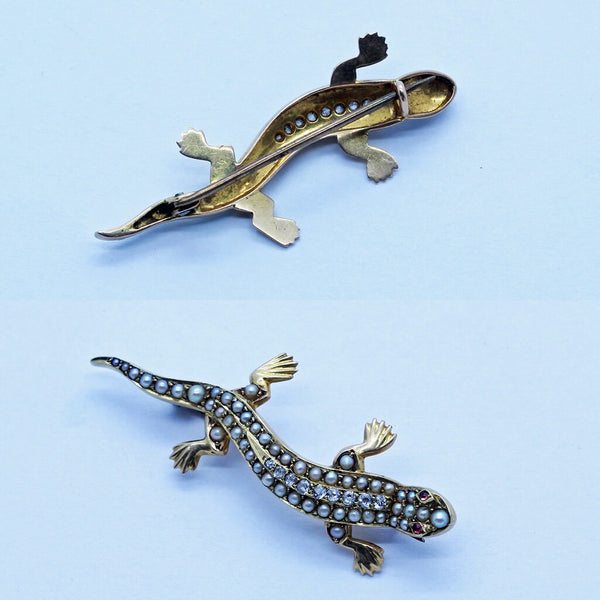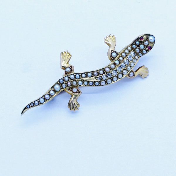 Description : Modelled as a lizard or salamander with naturalistic deatil to splayed feet. The body curves sinuously, as though the little creature has just become surprised by something unexpected. Tiny collette-set cabochon ruby eyes. Body with pearls bordering a central line of rose cut diamonds. Small, but very pretty example of animal jewelry.