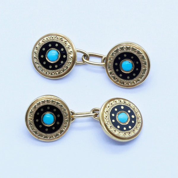 Description : Small cufflinks suitable for a man or a woman. Round shape. The center is set with a cabochon turquoise. This is surrounded by a band of black enamel with gold dots forming a ring in its center. This is followed by concentric bands of gold: two narrow and a wider, engraved with a zig-zag pattern. All this is raised above the outer gold border.