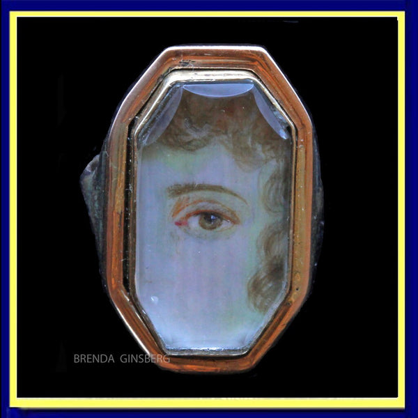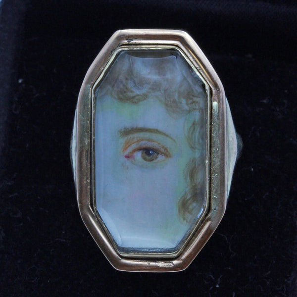 Description : A very early eye miniature ring. It depicts the left eye of a woman with blond curls above her hazel brown eye. Set in an elongated, octogonal stepped gold mount under a glazed compartment. Stepped gold mount with simple beading indented into the sides - barely visible with the naked eye. Simple gold shank. The exact origin of eye miniatures is steeped in mystery and debate. It was said that the Prince Regent had one made for his secret wife, Mrs Fitzherberg. Eye rings then became very popular. Only the giver and the receiver would know the identify of the portrait adding to the romance and excitement of the gift. This is a particularly early example, dating to the late 18th century. It can of course, be worn by either a man or a woman.