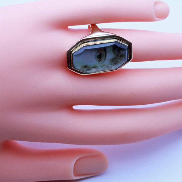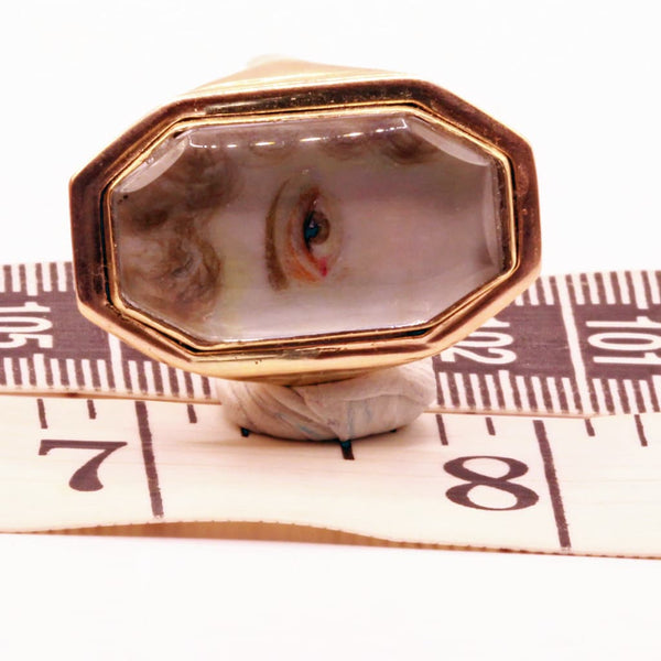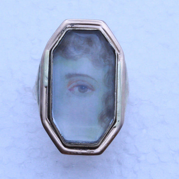 Antique Georgian ring. 14k gold with glazed compartment over a miniature hand painted portrait of eye. Made in England, UK, circa 1780-1790. Unisex - can be worn by a man or a woman.