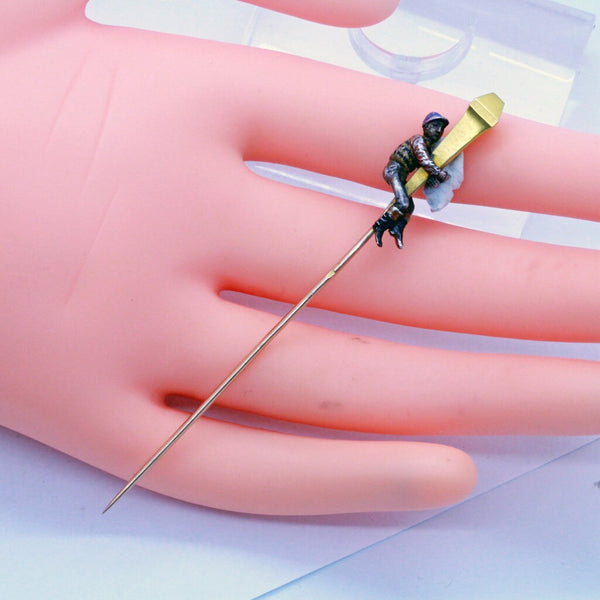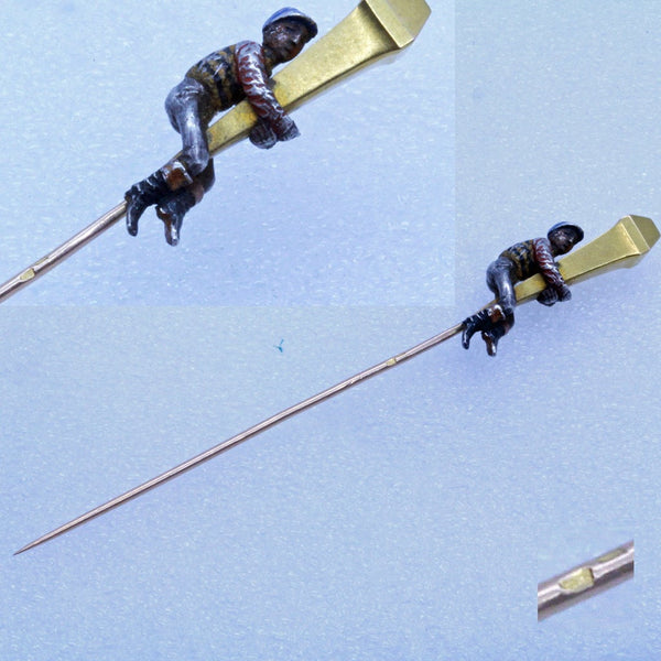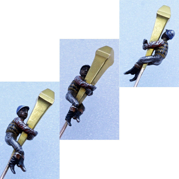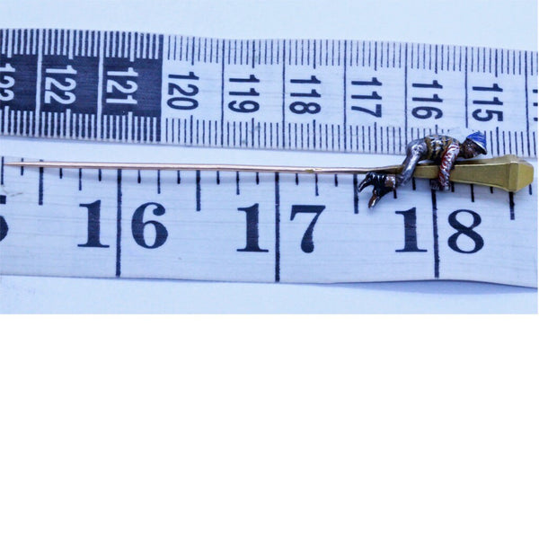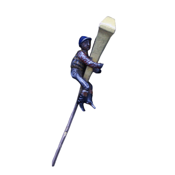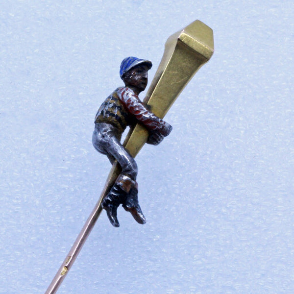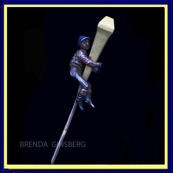 Description : A wonderful novelty pin to hold you tie or scarf in place or simply to pin on your lapel. During the late 19th century, the Victorians had a great sense of humour and whimsy and created wonderful figural jewelry, especially in the form of scarf/tie/cravat pins. In particular, Vever illustrates a number of such pins designed by Louis Rault for Boucheron eg page 899. (ours does not have a known maker). The pin is in the form of a nail or possibly a lamp with a jockey embracing it near the top. The jockey is wonderfully modelled with his arms and legs hugging and twining around the nail/lamp. He is wearing black boots with broad gold turnovers, jodhpurs of silver and a striped enamel and silver jacket. The body in yellow and sleeves in red. His jockey's cap is striped in silver and blue. Fine details to his face. Perhaps the figure lampoons and commemorates a particular event or person from the 19th century, but we will probably never know. It is clearly an amusing and beautifully made piece of jewelry, made to perform a function, as well as a great sense of humour. Great conversation piece. Suitable for a man or a woman.