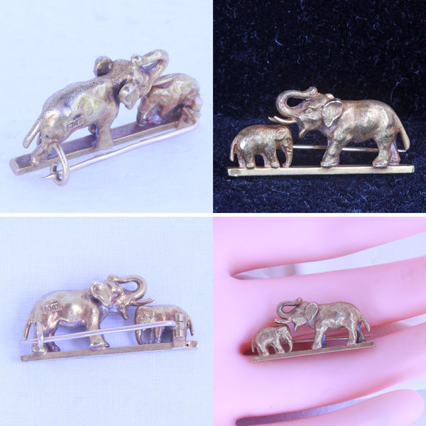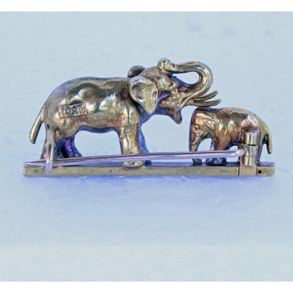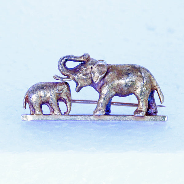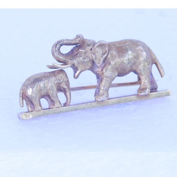 Description : Brooch depicts a mother elephant and her baby, both standing in profile. It is said that elephants are happy when their trunks are shown up. This Momma has her trunk way up, curling towards her back. The baby hovers under the protection of her large tusks. Beautifully and naturalistically modelled animals. Even the back has facial details of eyes and large ears. Textured skin.