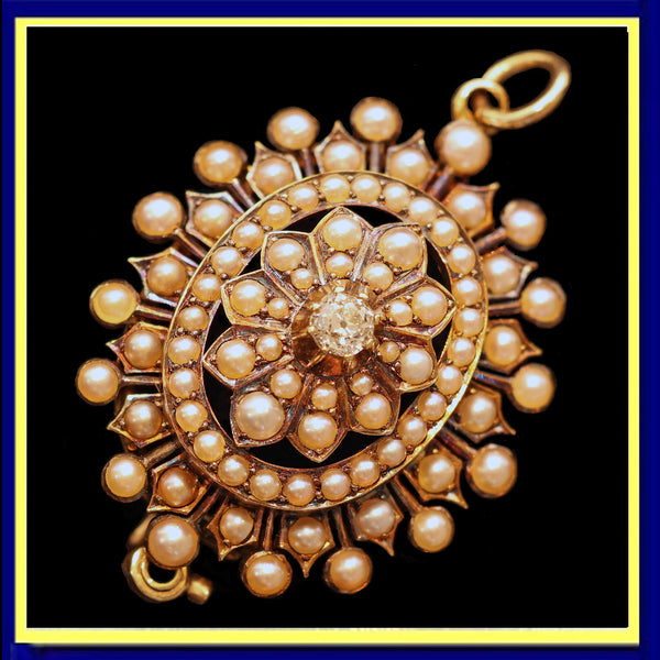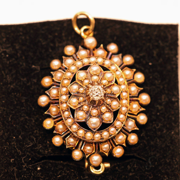 Antique Victorian brooch pendant. Gold diamond pearls. Made in England 2nd half of the 19th century.