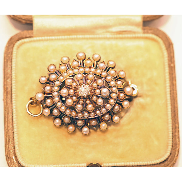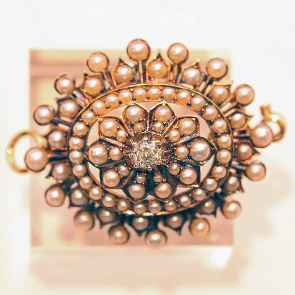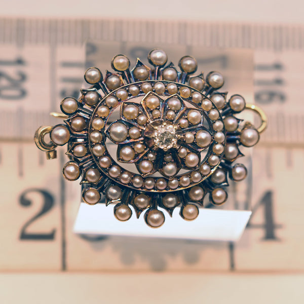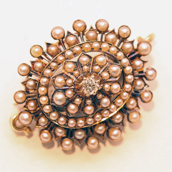 An oval, openwork, slightly spherical shape that rises in concentric circles from the outside to the center. The center is set with an old cut diamond in a raised gold colette with crimped sides. Bright, clear diamond forms the focal point of the brooch. Radiating around it is a ring of gold cells - that come to a point at their outside (like an antique pen nib). Within each cell is a tiny pearl and then a larger one, forming the first two of the concentric, well-matched pearl circles. Seeming to float around these, is another ring of pearls with a step down to a similar arrangement of gold cells containing a single pearl each and alternating with alightly larger pearls on gold 'stalks' forming the outer border. Pearls are well matched. The varying sizes of the concentric rings adds subtle interest to the design.