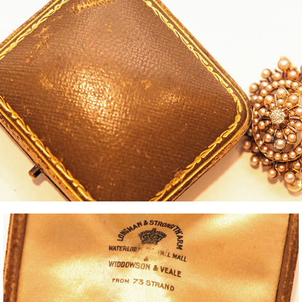 As described above, the crown in the lid of the retailer indicates a very high end establishment that sold to Queen Victoria and her family. Pearls have traditionally been valued above any other gemstone (including diamonds) and were the jewel of choice for royalty. Think Queen Elizabeth the First and her dresses and hair entirely pearl encrusted. Her namesake, Queen Elizabeth II like her own mother, another Queen Elizabeth, was rarely seen without her pearls.