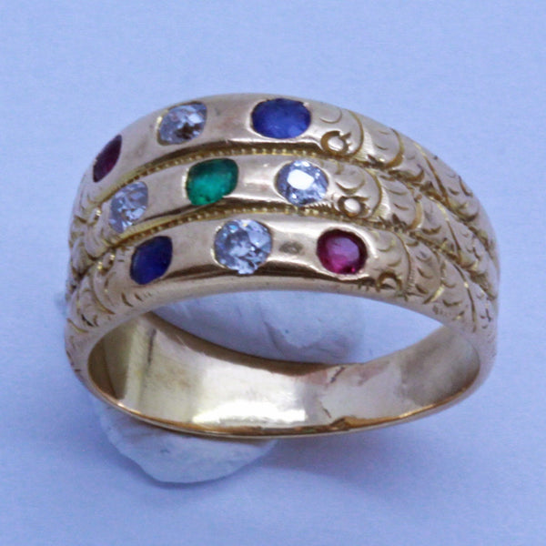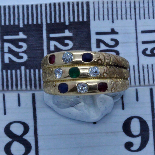 Antique Victorian ring. 14k yellow gold and colored stones including diamonds, rubies, sapphires. Unisex - suitable for a man or a woman.