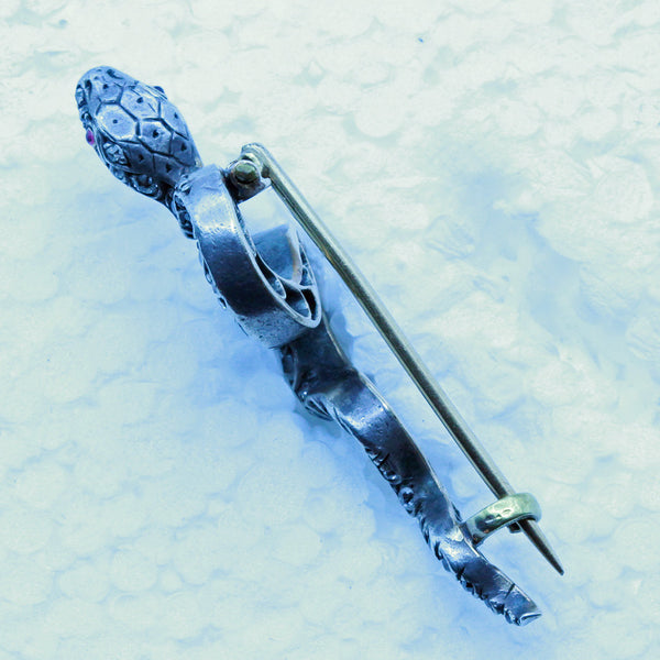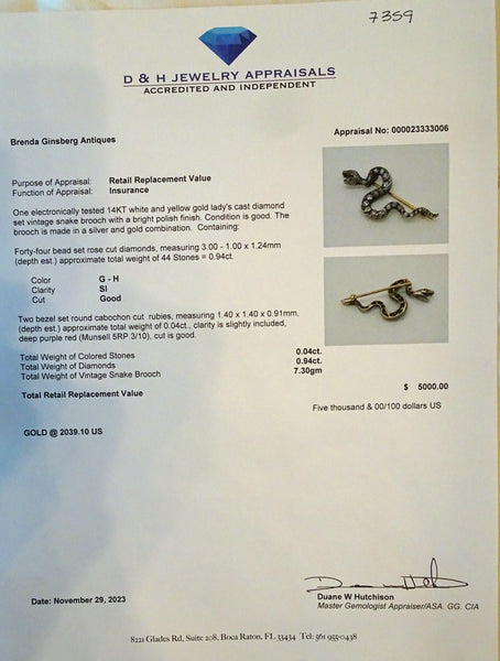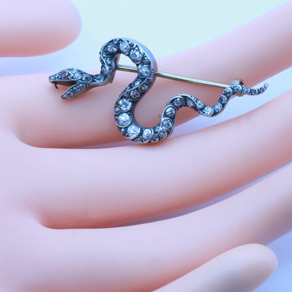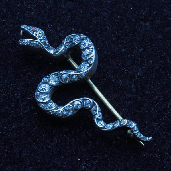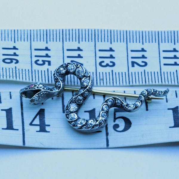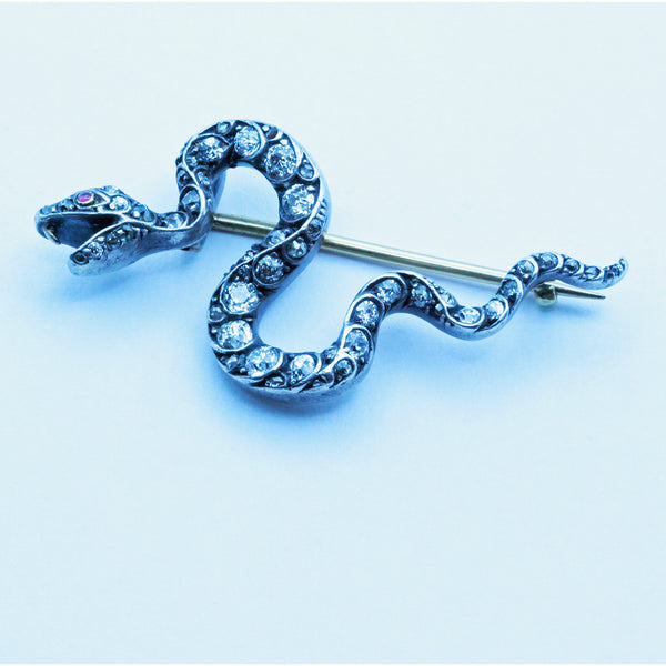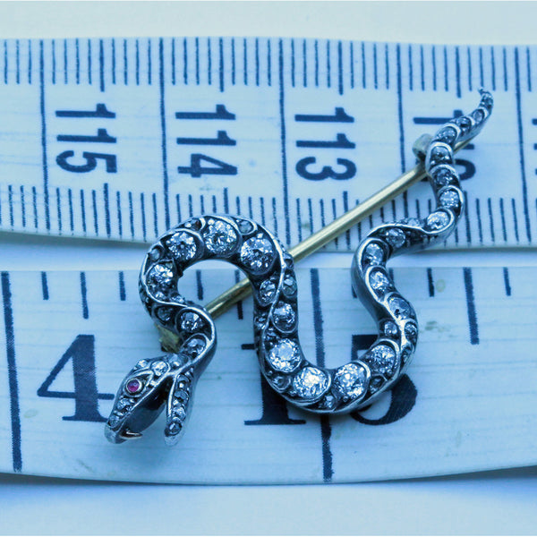 Description : Marvellous snake brooch depicting a writhing, wriggling snake. The entire body set with diamonds. During the Victorian period, diamonds were almost always set in silver, which was seen to show them off to better effect in candle or gas light. Other gems were set in gold. The silver was layered over gold as in this case, with the gold back. Pin with c-clasp is also gold. Tiny cabochon ruby eyes.