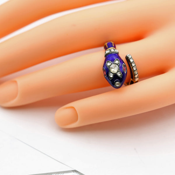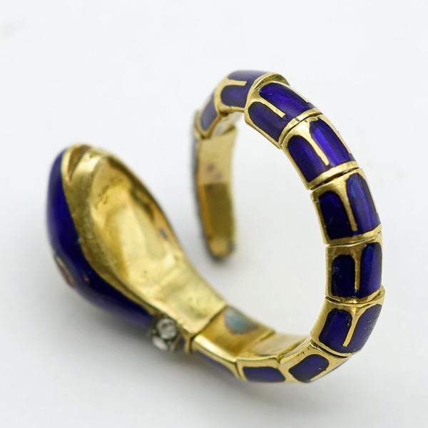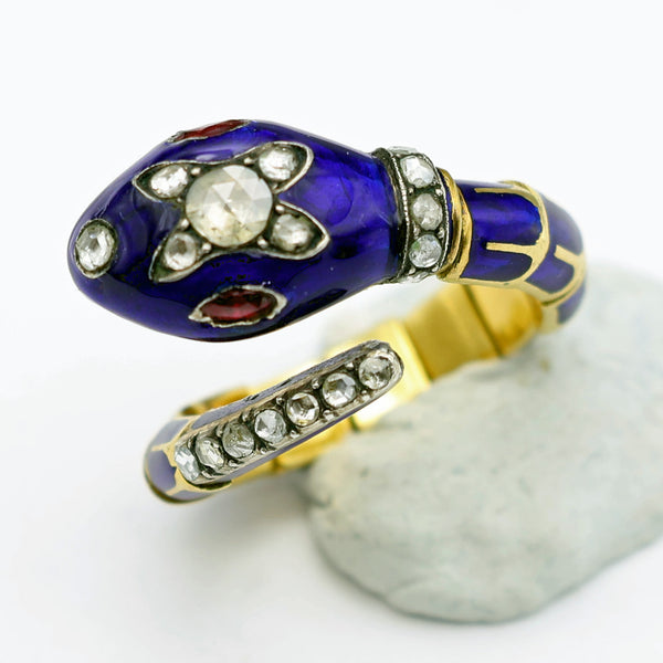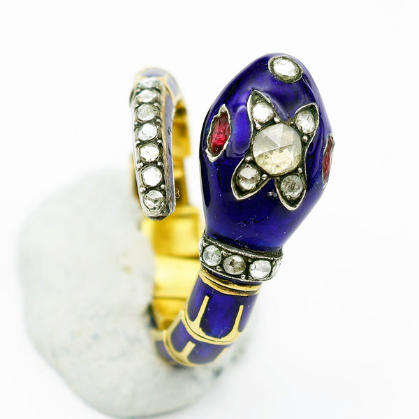 A truly exceptional snake ring. The head and neck are followed by 11 segments that form the body and tail which come around in a circle to meet and bypass the head. These segments are articulated - each one is individually made and finely joined together to form a single whole. Each segment is very richly enameled in bright royal blue with the bright, high karat gold forming the reptile-skin design. The tail narrows to a point. It is pave-set with 7 diamonds. They are set in silver, which was the custom for diamonds during the 19th century. The neck begins with a raised cylindrical gold ring, followed by a raised ring of pave set diamonds, also in silver with millegrained borders. Also enameled in the wonderful rich blue, the head is set with a number of rose-cut diamonds, both on top and in front, as the nose. The eyes are set with navette-shaped rubies of a fantastic glowing deep red color. Gold mouth is slightly open.