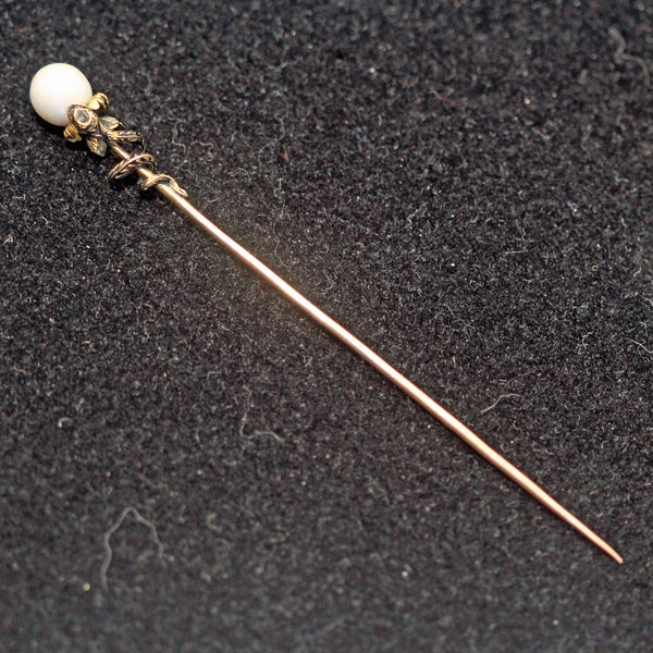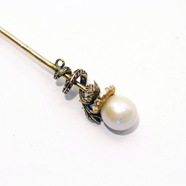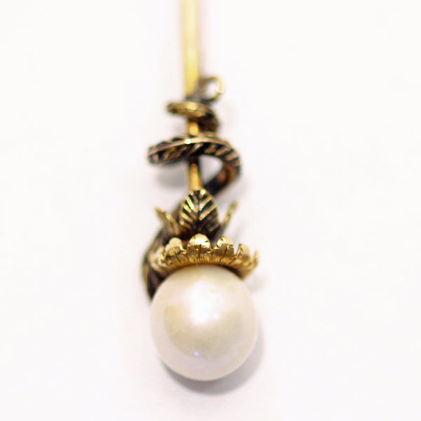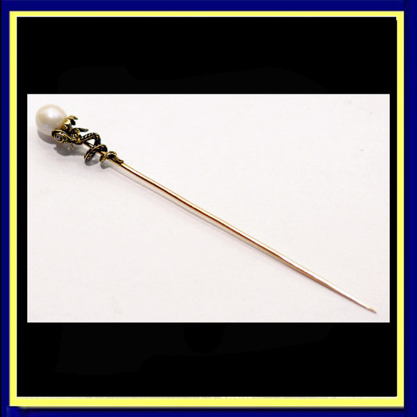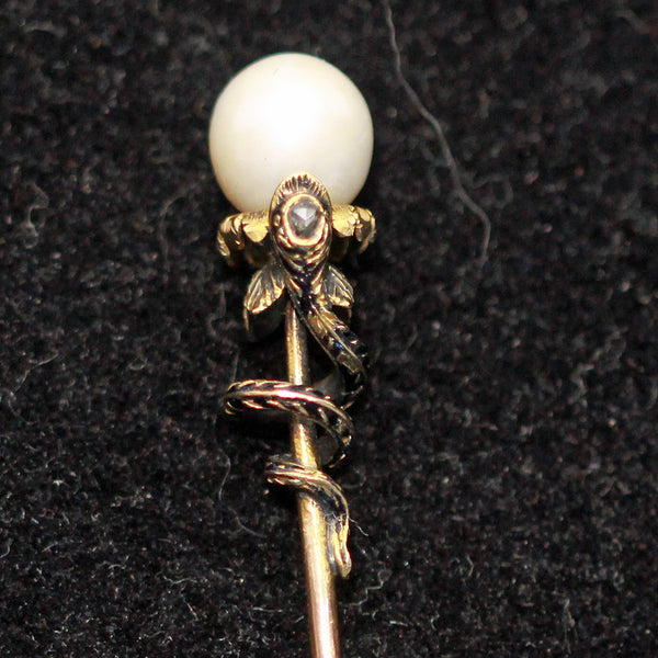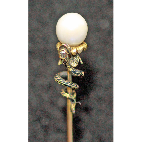 Description : A long tie pin, tapering towards the pointy end and with a pearl set at the opposite side. Pearl has not been tested (may be natural or cultured). The pearl is the center of a flower form, emerging from golden, engraved sepals or petals that curve back towards the pin. Tiny and dainty and very fine, they entirely encircle the pearl. Slightly larger, similar foliage encircles the flower from below. In front, the leaves are overlapped by a snake's head. The snake's body coils around the pin, tapering towards the tail. The snake's body and head are enamelled in black, forming a scaly pattern against the gold. The head of the snake is set with a small diamond. Very small details.