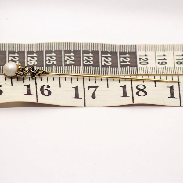 Antique Victorian tie pin. 14k gold, pearl and enamel. Made in the UK, 19th century.