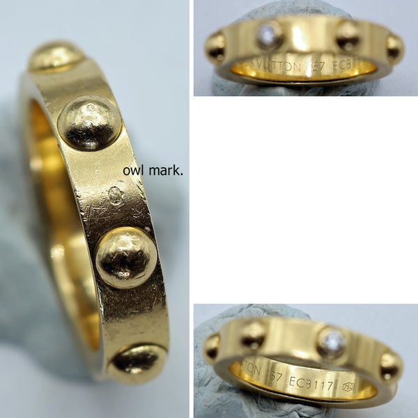 There are a host of marks on the ring. The inside is engraved Louis Vuitton 57 ECB 117 and 750 (for 18k gold). The mount around the diamond is engraved LOUIS VUITTON. The outside of the ring (top) has French owl mark for 18k gold and the outside on the side has the diamond-shaped lozenge with LV hallmark.