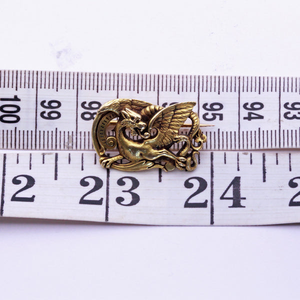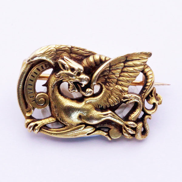 Description : Jules Wiese and then his son, Louis, were renowned for their wonderful, sculptural jewelry in the Revivalist style. Their work echoed the Gothic, Renaissance, Medieval and Ancient Greek periods. This brooch is in the form of a large, winged dragon with a snake and an eagle as part of the swirling gold background. Steeped in ancient mythology, the brooch is beautifully made - a wonderful piece of wearable sculpture. Very solid, very wearable and exciting and suitable for a man or a woman.