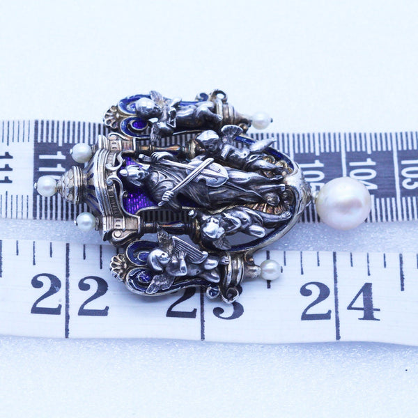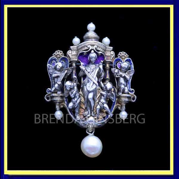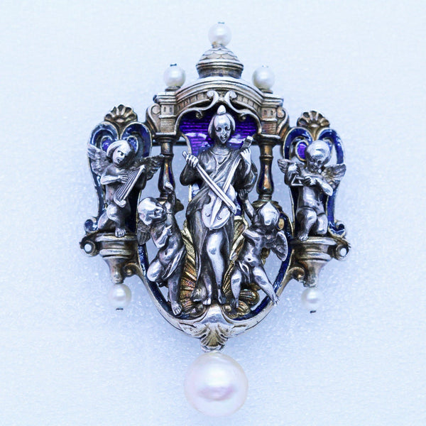 Description : Quintessential example of the Renaissance Revival work of Francois Desire Froment-Meurice. Highly sculpted in the round, the brooch has to be held in the hand to appreciate the dimentionality of the jewel. Crafted in silver and gold with a deep royal blue guilloche enamel background to the Renaissance domes and architectural features. The brooch features St Cecilia, saint of musicians and is known as L'Harmonie in French. She is playing a violin-like instrument and is surrounded by 4 cherubs, one of which plays a harp and one of which plays a triangle.