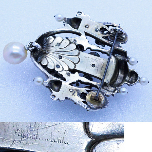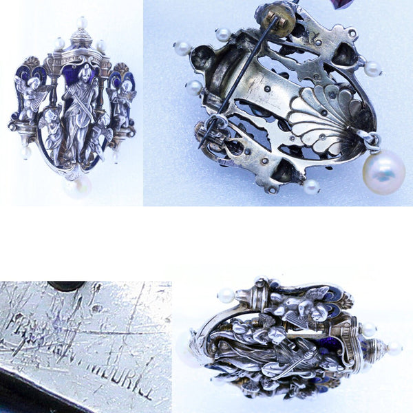 Condition: Minor wear commensurate with age. One cherub has lost his hand. The pin appears to be a replacement. All but one of the pearls are replacements. Please see enlarged pictures and don't hesitate to ask questions which we will do our best to answer.